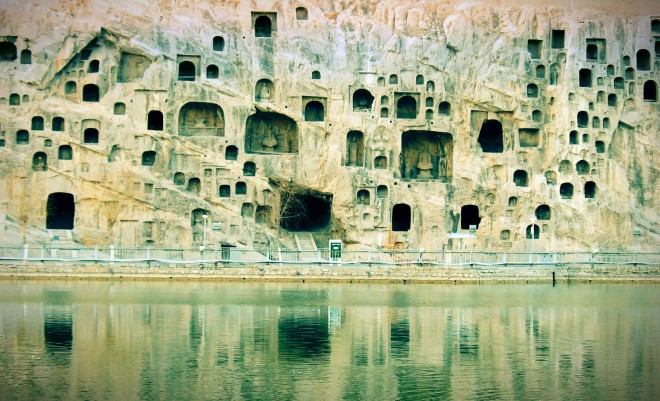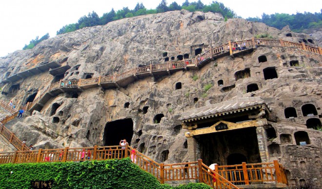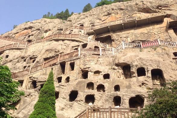 龙门石窟位于中国河南省洛阳市南郊的龙门山和香山崖壁上,是中国四大石窟之一,国家5A级景区。开凿于北魏孝文帝年间,今存有窟龛2345个,造像10万余尊,碑刻题记2800余品。其中“龙门二十品”是书法魏碑精华,褚遂良所书的“伊阙佛龛之碑”则是初唐楷书艺术的典范。