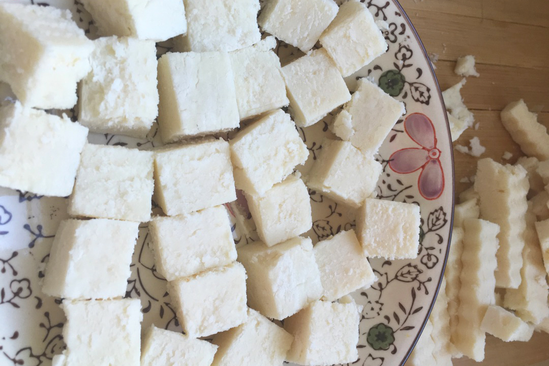 【味道】奶豆腐,蒙古语称“胡乳达”,是蒙古族牧民家中常见的奶食品,是用牛奶、羊奶、马奶等经凝固、发酵而成的食物,形状类似普通豆腐,其作法先将酸奶中的奶油提取出后,将其中水分煮干使其凝固,再放入模子中成型或以布袋挤压成型之后晒干可食用且便有保存。