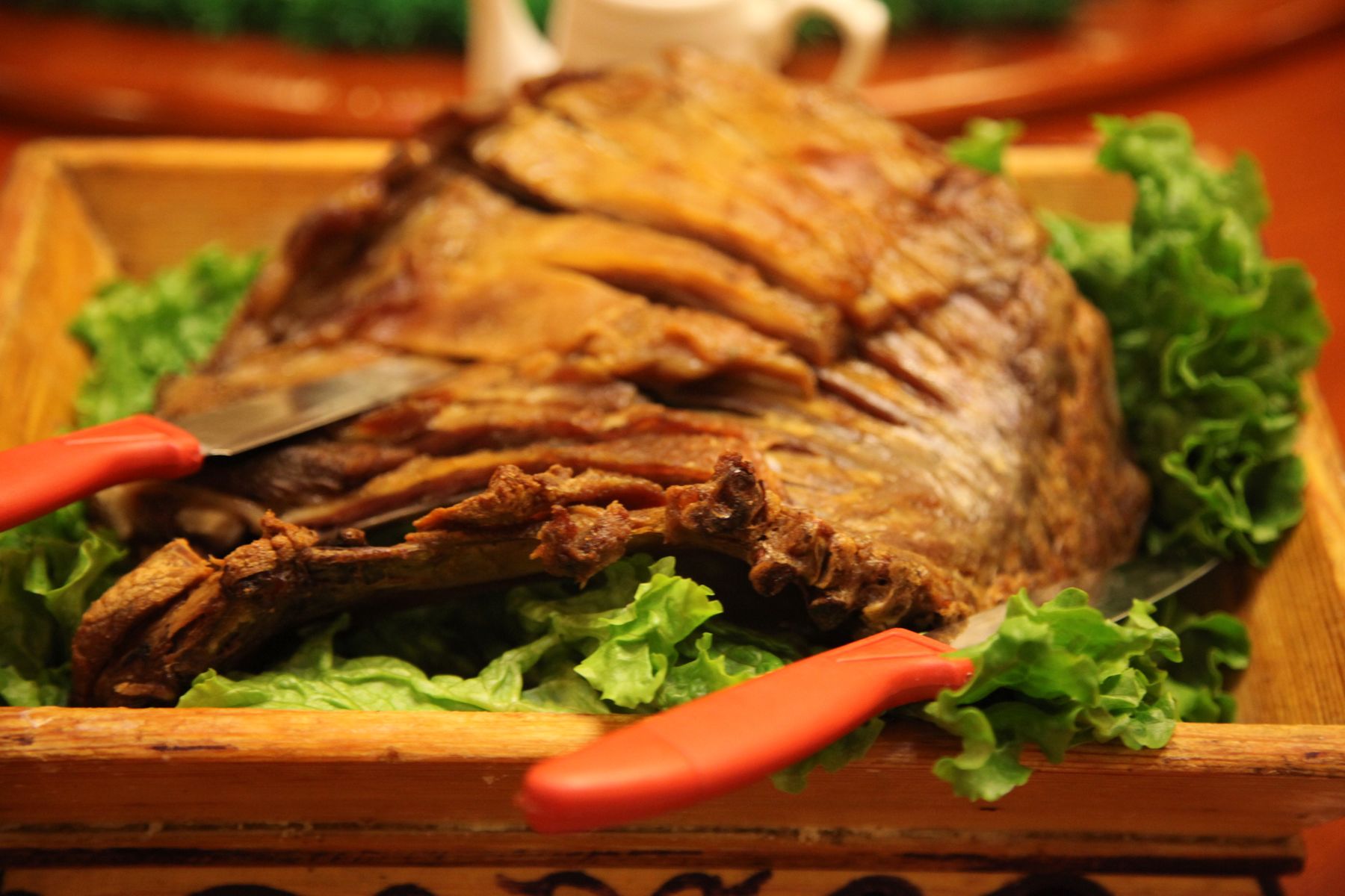 【味道】手把肉是蒙古人传统的食品方法之一,也是蒙古族日常生活中肉食的主要吃法。做法是将肥嫩的绵羊开膛破肚,剥皮去内脏洗净,去头去蹄,洗净,卸成若干块,放入白水中清煮,待水滚肉熟即取出,置于大盘中上桌,大家手拿蒙古刀大块大块地割着吃。因不用筷子,用手抓食而得此名。